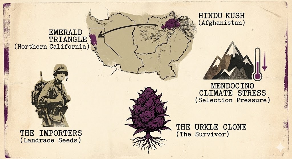 The Origins: Traced back to Afghani landraces brought home by Vietnam Veterans and travelers in the 1970s.
